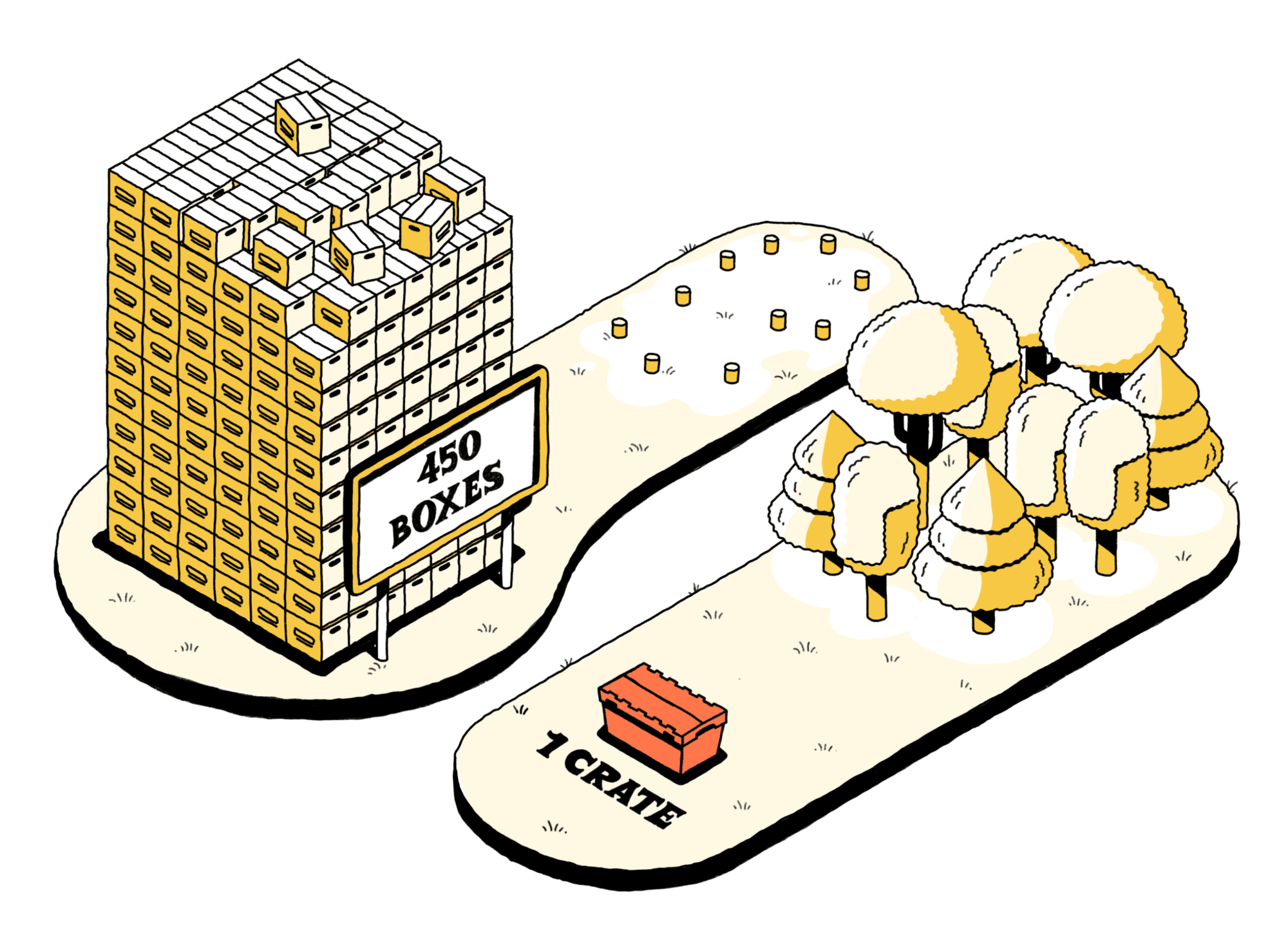 Cardboard ultimately ends up as solid waste or being incinerated. That’s a lot of trees that end up as waste! Reusing items like plastic crates can be even more environmentally friendly than recycling.